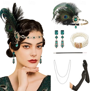 Anos 20 Faixa De Cabelo Estilo Melindrosa O Grande Gatsby Sem Colarinho Fantasia Mulheres Carnaval Baile de Máscaras Festa Mascarilha Adulto 1 Par de Brincos 1 Bracelete Luvas Todas as Estações