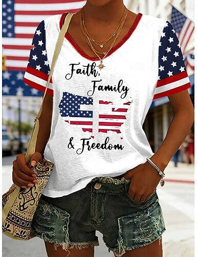 Dia da Independência Americana Mulheres Camiseta Imprimir Gráfico Bandeira Vintage à moda Casual Manga Curta Decote V Tops regulares Diário Preto Branco Vinho Vermelho Tinta Azul Verão Primavera