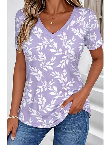 Mulheres Camiseta Imprimir Floral Gráfico Plantas à moda Clássico Casual Manga Curta Decote V Tops regulares Diário Roxo Laranja Verde Cinzento Verão Primavera
