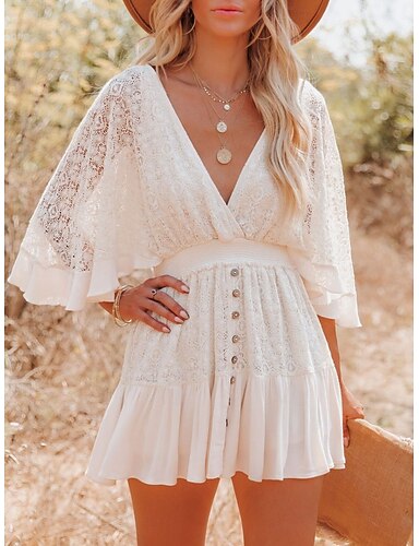 Mulheres Minivestido Vestido de renda Vestido branco Elegante Moda Moderno Ao ar livre Férias Para Noite Normal Tecido Manga Curta Decote V Preto Branco Verão Primavera