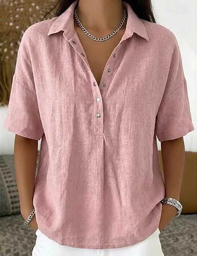 Mulheres Blusa Botões Côr Sólida à moda Casual Manga Curta Decote V Tops regulares Diário Azul Preto Branco Vermelho Damasco Verão Primavera