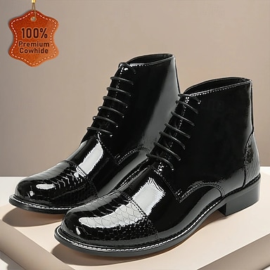 Botas masculinas pretas de couro legítimo polido, modelo cano curto - design elegante e brilhante com bico fino, ideais para eventos semiformal, casamentos e trajes de noite.