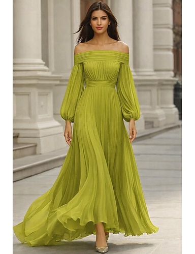 Linha A Longo Vestidos de noite Vestidos para convidadas de casamento Vestido formal Elegante Manga Longa Ombro a Ombro Casamento Formal Chiffon com Pregas Franzido