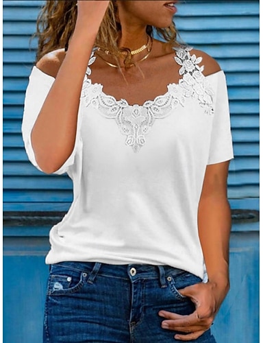 Mulheres Camisa Social Blusa Tops de renda Renda Tecido à moda Clássico Moderno Manga Curta Decote V Tops regulares Diário Feriado Para Noite Preto Branco Rosa Azul Claro Verão Primavera