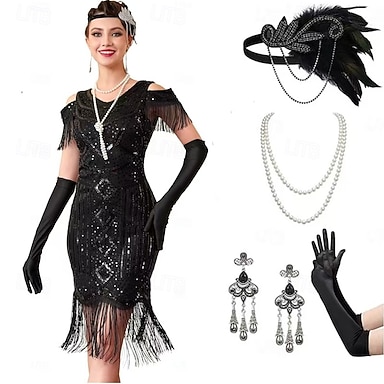 Conjunto Loucos anos 20 Anos 20 Longo Vestido de Festa Roupa Conjunto de acessórios com acessórios Mangas curtas O Grande Gatsby Convidado do casamento Paetês Lantejoula Decote V Fantasia Mulheres