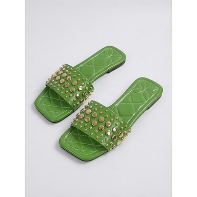 Sandálias femininas verdes com tachas – sandálias casuais de praia, rasteiras e de bico aberto, perfeitas para as férias de verão.