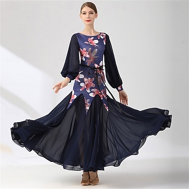 vestido de dança de salão com estampa floral para mulheres - vestido de manga longa em corte A com cinto e saia de chiffon para competições, dança latina e eventos de dança - azul marinho & rosa