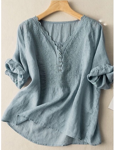 Mulheres Blusa Linho de algodão sintético Bordado Côr Sólida à moda Casual Meia Manga Decote V Tops regulares Diário Azul Preto Branco Rosa Azul Marinha Verão Primavera