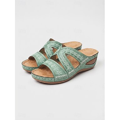Sandálias femininas verdes com plataforma – sandálias rasteiras estilosas com detalhes florais e plataforma em imitação de espadrille, perfeitas para passeios casuais, férias de verão e festas na