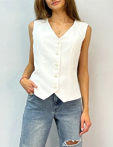 Mulheres Tops de verão Blusa Tops elegantes Franzido Patchwork Botões Côr Sólida Tecido Elegante Vintage senhoras Sem Manga Decote V Tops regulares Diário Trabalho Feriado Branco Verão Primavera