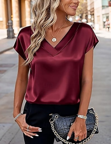 Mulheres Blusa de cetim Blusa Patchwork Tecido Elegante Vintage à moda Manga Curta Decote V Tops regulares Diário Feriado Para Noite Preto Branco Champanhe Vinho Vermelho Verão Primavera Outono