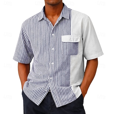 Homens Camisa Social Textura Camisa casual camisa de botão Camisa de algodão Azul Rosa Roxo Marron Azul Claro Manga Curta Listrado Colarinho de Camisa Casual Diário Patchwork Roupa Elegante Moda