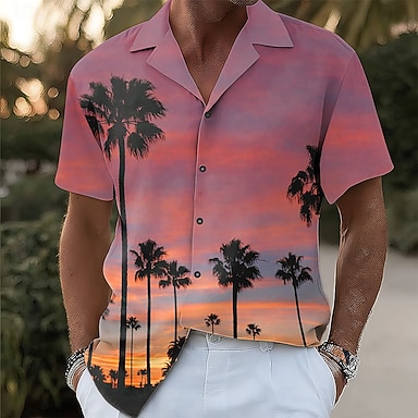 Homens Coqueiro pôr do sol Plantas Tropicais Camisa Social Camisa cubana Camisa havaiana Manga Curta Havaiana Férias Feriado Roupa de Praia Verão Primavera Camisa com gola de acampamento Impressão 3D
