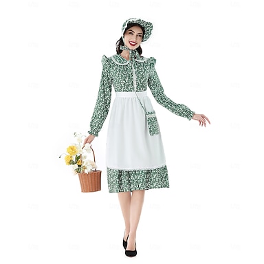 250º Aniversário EUA século 19 década de 1800 Vestido Pradaria Conjunto de touca e avental Manga Comprida Garota Pioneira Colonial Pioneiro Guerra Revolucionária Floral Fantasia Mulheres Dia Das