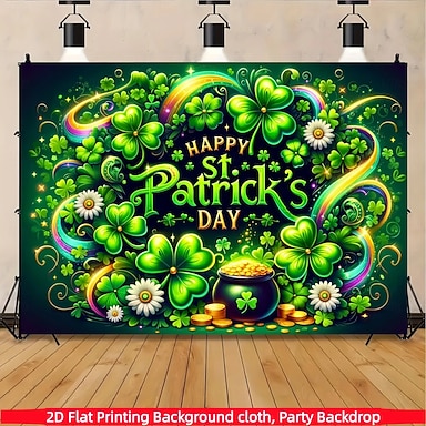 Tapeçaria de parede com estampa plana 2D para o Dia de São Patrício, com desenho de trevo e pote de ouro, ideal para decoração festiva de festa irlandesa.