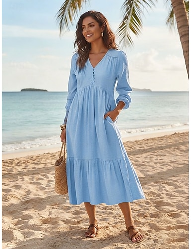 Mulheres Vestido Longo Linho de algodão sintético Vestido Boho Vestido casual Elegante Moda Moderno Ao ar livre Férias Para Noite Normal Tecido Manga Longa Decote V Azul Claro Verão Primavera