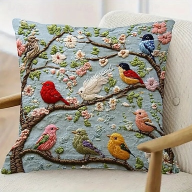 Capa de almofada inspirada em pássaros da primavera, com estampa plana 2D, estilo moderno, bordado em um lado, fechamento com zíper, tecido de poliéster, capa de almofada decorativa para casa.