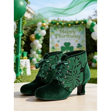 Botas femininas de veludo verde com cadarço e detalhes de renda floral – sapatos estilosos para o Dia de São Patrício, com design de inspiração vintage para eventos festivos e comemorações de feriados.