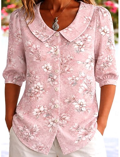 Mulheres Camisa Social Floral Gráfico Vintage à moda Coleira Peter Pan Tops curtos Diário Feriado Para Noite Verde Claro Rosa Laranja Verão Primavera