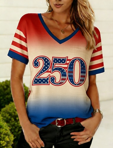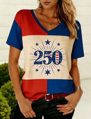 Dia da Independência Americana Mulheres Camiseta T-shirt Imprimir Gráfico Bandeira americana Boêmia Vintage à moda Manga Curta Decote V Tops regulares Diário Para Noite Final de semana Azul Vermelho