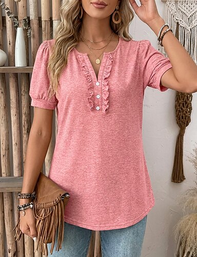 Mulheres Tops de verão Botões à moda Clássico Manga Curta Decote V Tops regulares Casual Diário Para Noite Preto Branco Rosa Vinho Azul Marinha Verão Primavera