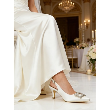 Sapatos de noiva brancos com tira no calcanhar – elegantes sapatos de casamento de bico fino com fivela de strass