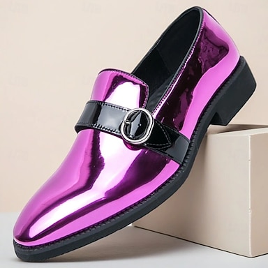 Sapatos masculinos rosa de verniz com fivela e detalhes em preto - sapatos sociais modernos para eventos elegantes.
