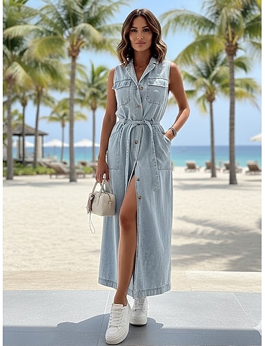 Mulheres Vestido Longo Vestido A Line Vestido de verão Casual Diário Normal Tecido Sem Manga Lapela Azul Verão Primavera