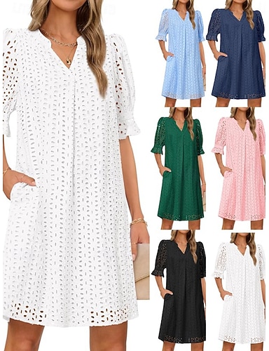 Mulheres Vestido no Joelho Vestido branco Vestido Ilhós Elegante Moda Moderno Ao ar livre Férias Para Noite Normal Tecido Manga Curta Decote V Preto Branco Rosa Azul Marinha Verão Primavera