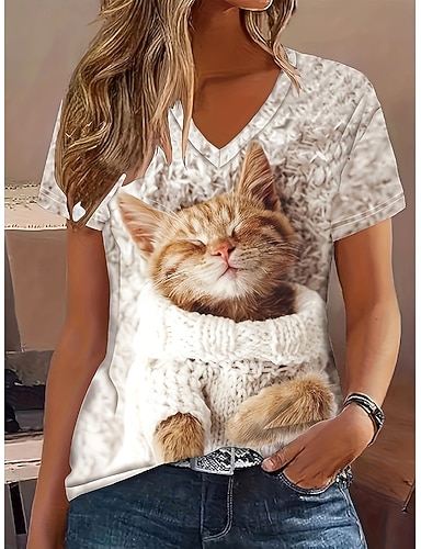 Mulheres Camiseta Imprimir Gráfico Animal Gato Vintage à moda Clássico Manga Curta Decote V Tops regulares Diário Final de semana Cáqui Verão Primavera Outono