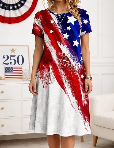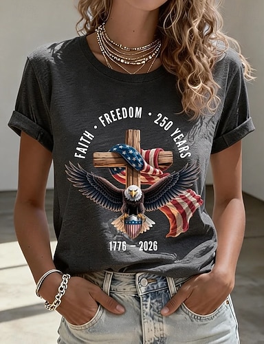 Dia da Independência Americana Mulheres Camiseta Imprimir Gráfico Bandeira Letra Vintage à moda Clássico Manga Curta Gola Redonda Tops regulares Diário Azul Preto Branco Cinzento Verão Primavera