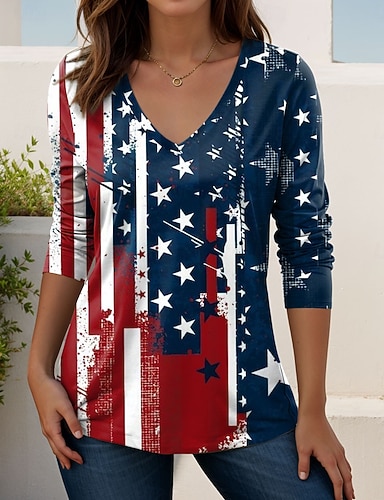 Dia da Independência Americana Mulheres Camiseta Imprimir Gráfico Borboleta Vintage à moda Clássico Manga Longa Decote V Tops regulares Diário Final de semana Azul Vermelho Roxo Verde Verão Primavera