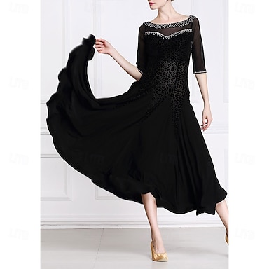 Vestido de dança de salão feminino com meia manga de malha valsa tango latino prática competição performance elegante saia preta em camadas de chiffon