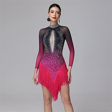 Dança Latina Vestido Pedrarias Mocassim Mulheres Festa Treino Espetáculo Manga Longa Elastano Fibra Sintética