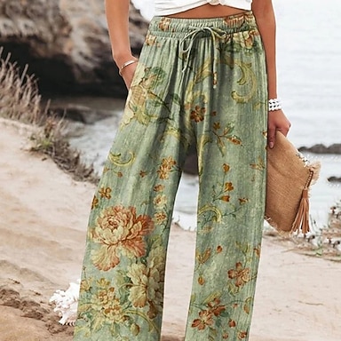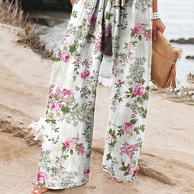 Mulheres Perna larga Calças Calça Palazzo Vintage Boho Comprimento total Cintura Alta Flor Cintura elástica Estampado Respirabilidade Confortável Rua Roupa Diária Para Noite Rosa claro Primavera
