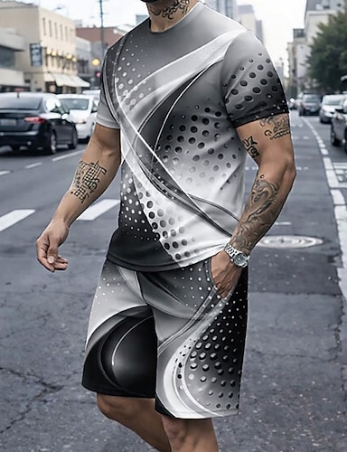 Homens Geométrico 2pcs Conjuntos de camisetas Tops de verão Manga Curta Calças curtas Gola Redonda Casual Diário Diário Férias Esporte Impressão 3D Verão Azul Vermelho Cinzento