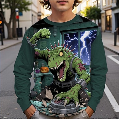 dia das Bruxas Para Meninos 3D Abóbora Dinossauro Camisa Camiseta Manga Longa Primavera Outono Moda Básico Infantil 4-12 anos Gola Redonda Ao ar livre Casual Diário Normal