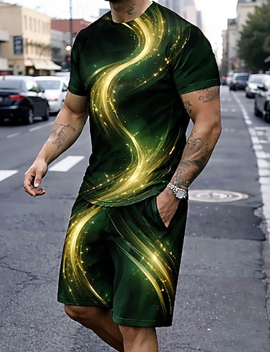 Homens Geométrico 2pcs Conjuntos de camisetas Tops de verão Manga Curta Calças curtas Gola Redonda Casual Diário Ao ar livre Férias Esporte Impressão 3D Verão Preto