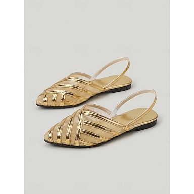 Sapatilhas femininas douradas de salto baixo, com bico fino e acabamento metálico, ideais para jantares em resorts e férias. &eventos noturnos de verão