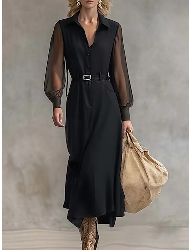 Mulheres Vestido midi Vestido preto Camisetão Vestido casual Vestido de trabalho Elegante Moda Moderno Ao ar livre Férias Para Noite Normal Tecido Manga Longa Colarinho de Camisa Preto Verão Primavera