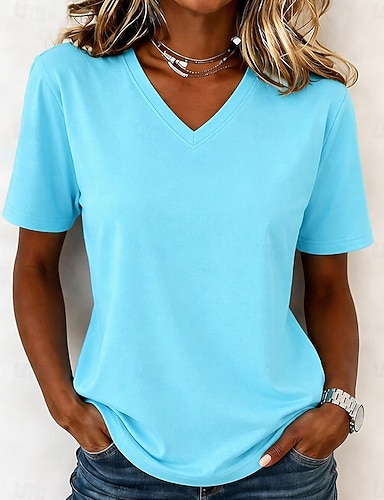 Mulheres Mistura de Algodão Côr Sólida à moda Básico Manga Curta Decote V Tops regulares Casual Esportes Final de semana Preto Verde Claro Rosa Roxo Claro Cinza Claro Verão Primavera