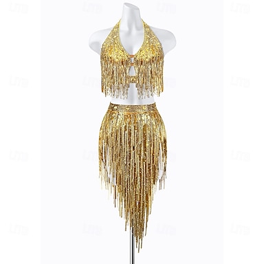 Conjunto feminino de dança latina com franjas de lantejoulas douradas - top cropped frente única &Traje de dança de salão com saia assimétrica