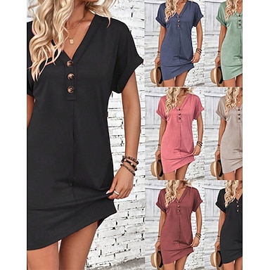 Vestido curto feminino em linho sintético, estilo casual, moderno, para uso diário, ao ar livre, férias, modelagem regular, liso, manga curta, decote em V, nas cores magenta, verde-azulado, preto e rosa, ideal para verão e primavera.
