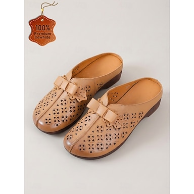 Tamancos femininos de couro cor camelo com recortes, detalhe de laço, solado macio e confortável, ideais para uso diário, viagens e jardinagem. &passeios casuais