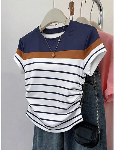 Mulheres Camiseta T-shirt Imprimir Listrado Moda à moda Clássico Manga Curta Gola Redonda Tops regulares Diário Para Noite Final de semana Azul Rosa Verão Primavera