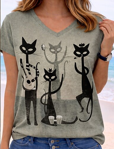 Camiseta Feminina Longa Manga Gráfica Animal Gato Vintage Estilosa Clássica Manga Longa Gola Redonda Tops Regulares Impressão Diária Cinza Primavera Outono Pré-Outono