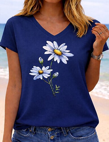 Mulheres Camiseta T-shirt Imprimir Floral Gráfico Plantas Moda à moda Clássico Manga Curta Pescoço Assimétrico Tops regulares Diário Para Noite Final de semana Azul Verão Primavera