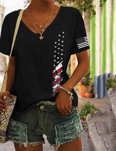 Camiseta Patriótica Feminina do Dia da Independência Estampa Gráfica Bandeira Vintage Estilosa Clássica Manga Curta Gola V Tops Longos Regulares Impressão Diária Azul Preto Vermelho Verde Verão