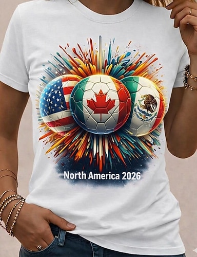Camiseta feminina de futebol com estampa gráfica vintage estilosa casual de manga curta com decote em V, ideal para uso diário, fim de semana, nas cores azul, preta, branca e vermelha, perfeita para