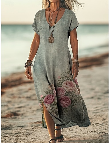 Mulheres Vestido Longo Vestido Boho Vestido casual Vestido A Line Vestido estampado Vintage Ao ar livre Praia Férias Normal Floral Gráfico Manga Curta Decote V Rosa Claro Amarelo Verde Claro Verde